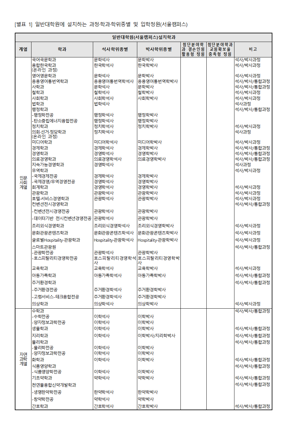 [별표 1] 일반대학원에 설치하는 과정·학과·학위종별 및 입학정원(서울캠퍼스).hwp