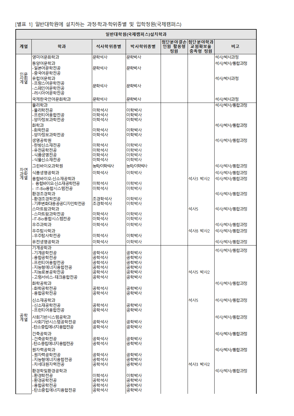 [별표 1] 일반대학원에 설치하는 과정·학과·학위종별 및 입학정원(국제캠퍼스).hwp