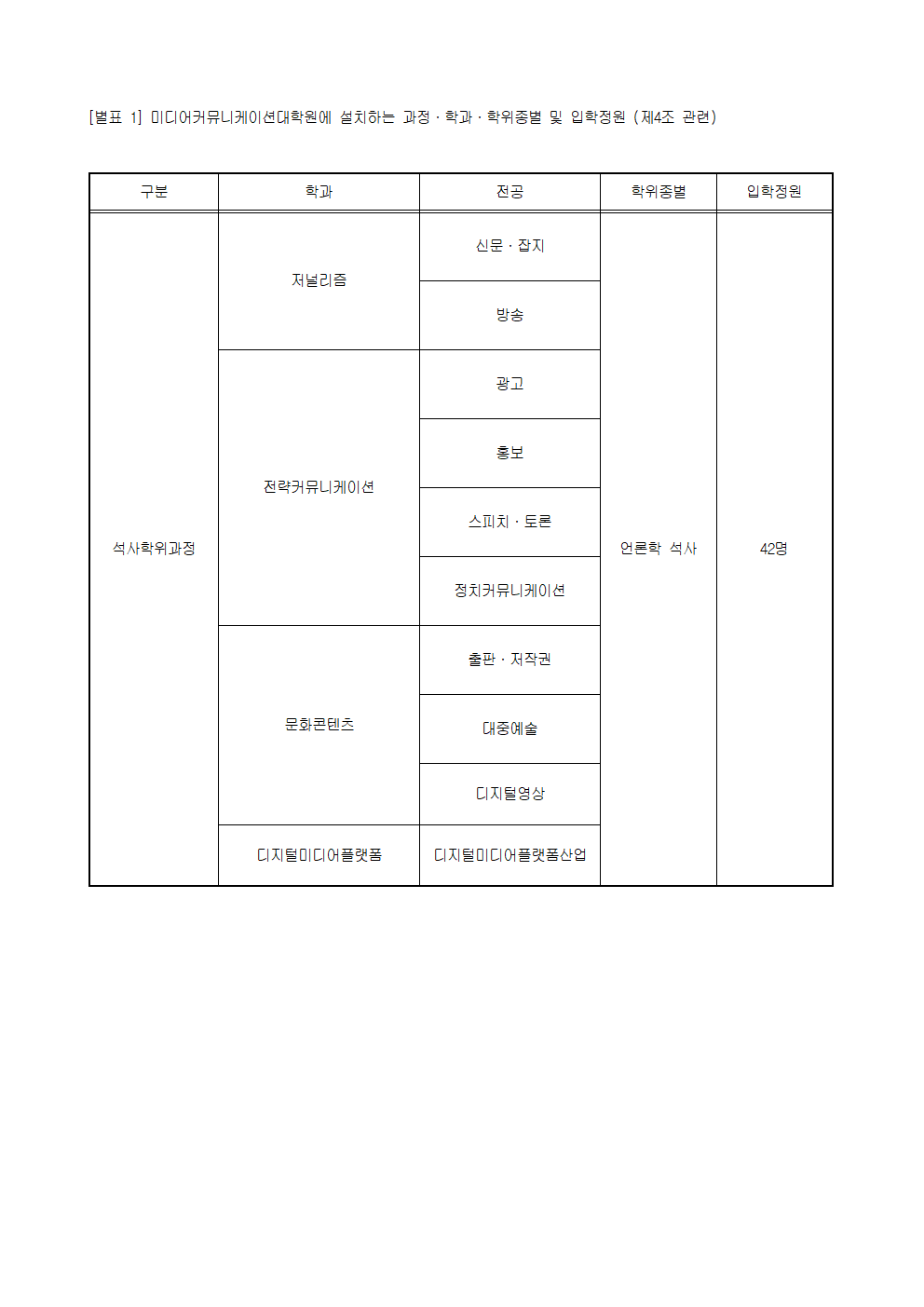 [별표 1] 미디어커뮤니케이션대학원에 설치하는 과정·학과·학위종별 및 입학정원 (제4조 관련) .hwp