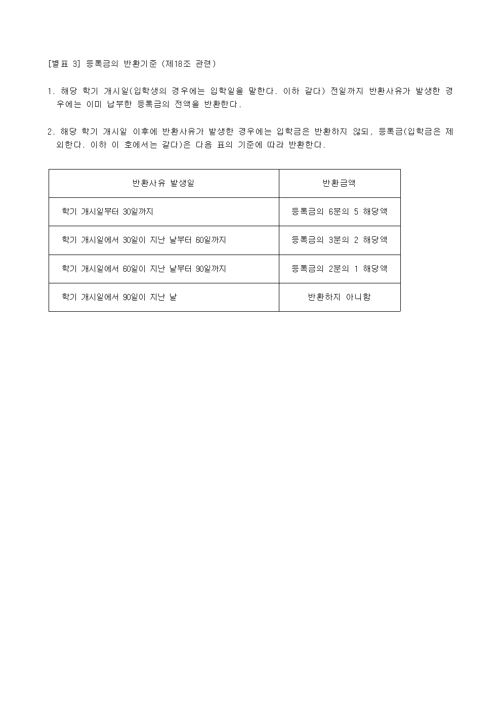 ⑤ 전항에 따르지 아니할 경우 [별표3] 반환기준에 의해 등록금을 반환한다.